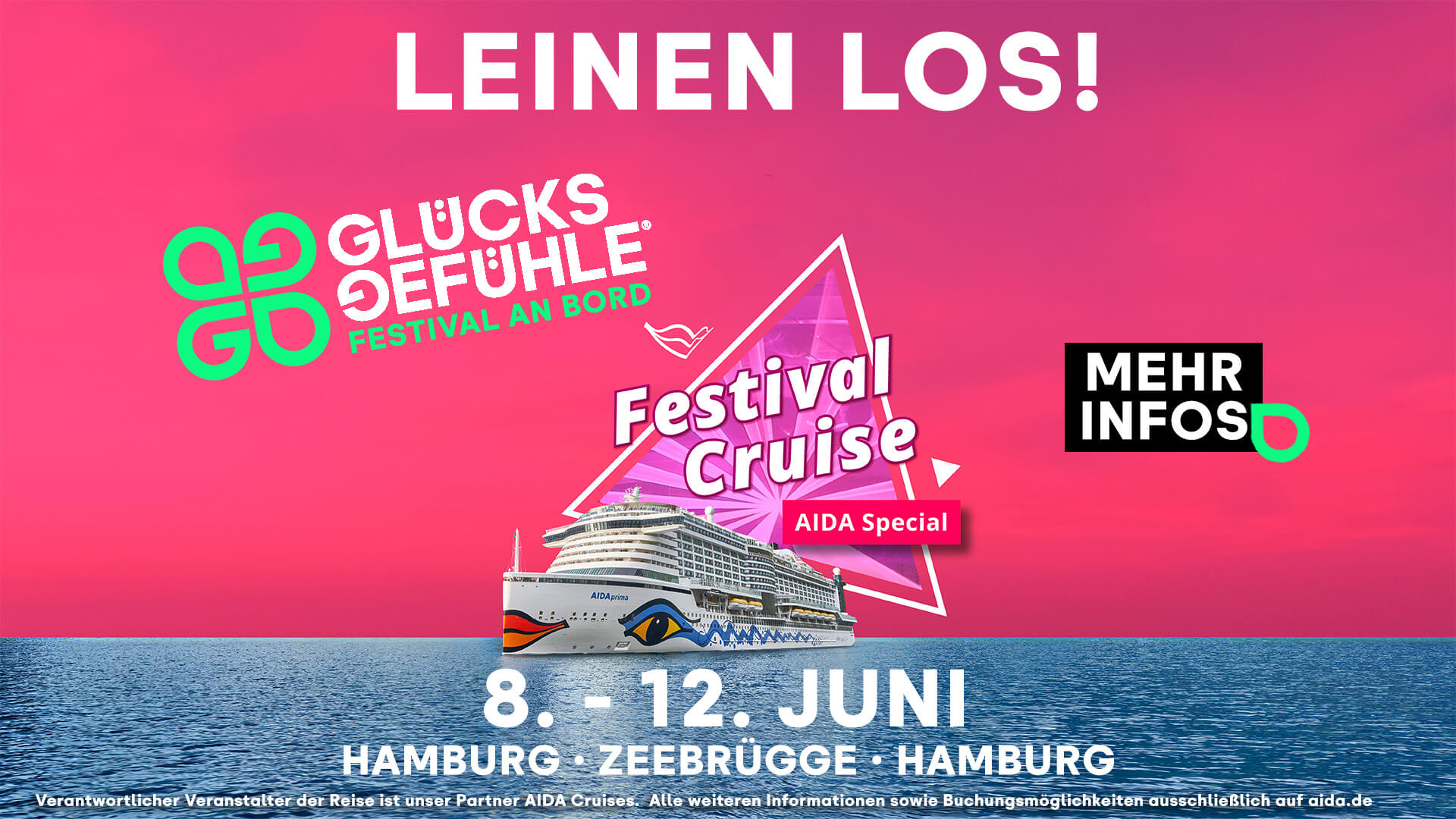 Nach dem Festival ist vor der FESTIVAL Cruise. Vom 8. bis 12. Juni 2026 heißt es: Party auf dem Meer! Mit der exklusiven AIDA FESTIVAL Cruise powered by GLÜCKSGEFÜHLE gehen wir an Bord der AIDAprima und feiern gemeinsam vier unvergessliche Tage voller Live-Acts, Beats, Emotionen und Meer.